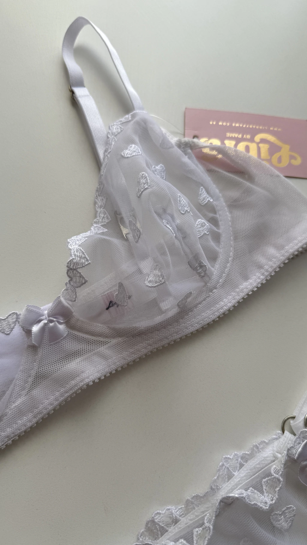 Conjunto de microtul con detalle bordados de corazones, con aro sin taza push up.. doble breteles en la bombis regulable.. hermoso conjunto coquette.. sensual y trasparencia.