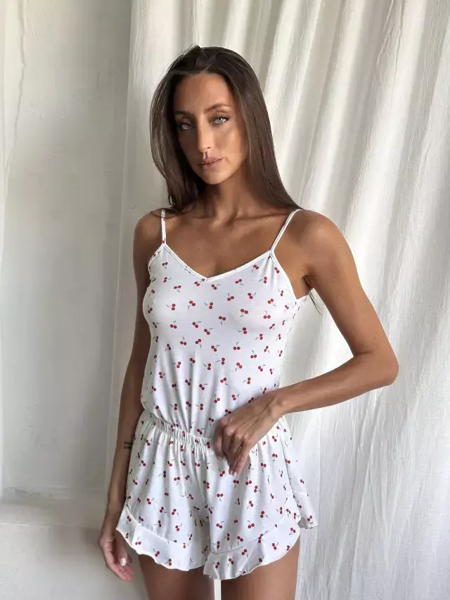 Pijama SARLY, un conjunto delicado y cómodo que combina un short y una solera con un encantador estampado de cereza. Confeccionado en algodón súper suave, ofrece una sensación de frescura y confort ideal para tus noches o momentos de relax. ¡Un imprescindible en tu guardarropa de descanso!